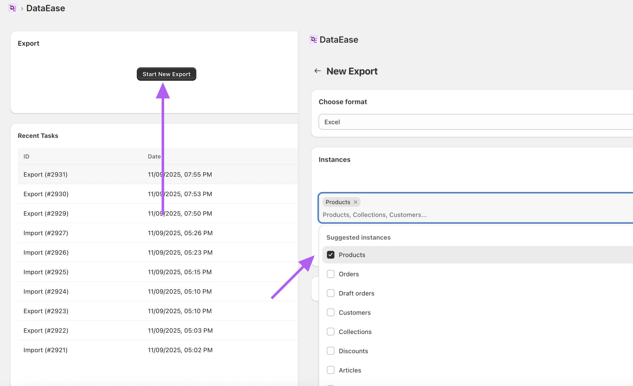 In DataEase, go to New Export → Products.