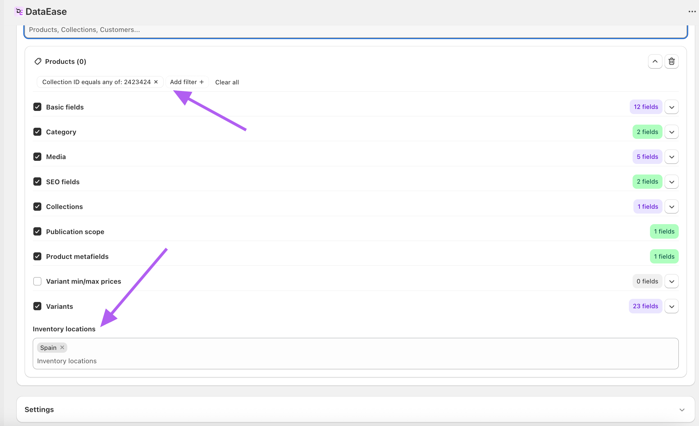 - You can combine Collection ID with Inventory locations to narrow both by catalog and by stock locations.