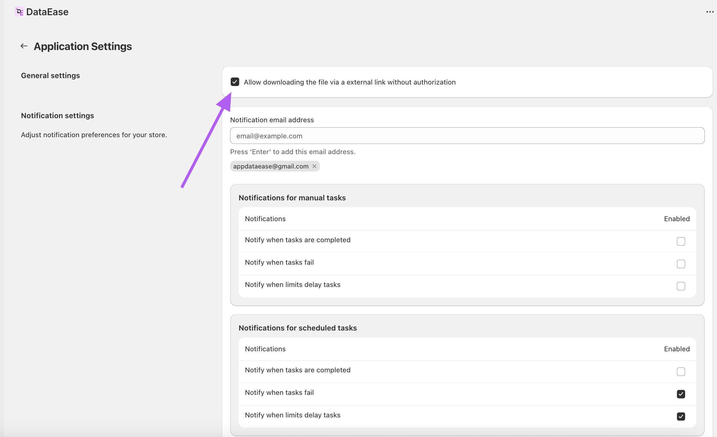 - In App Settings, enable: Allow downloading the file via an external link without authorization.
