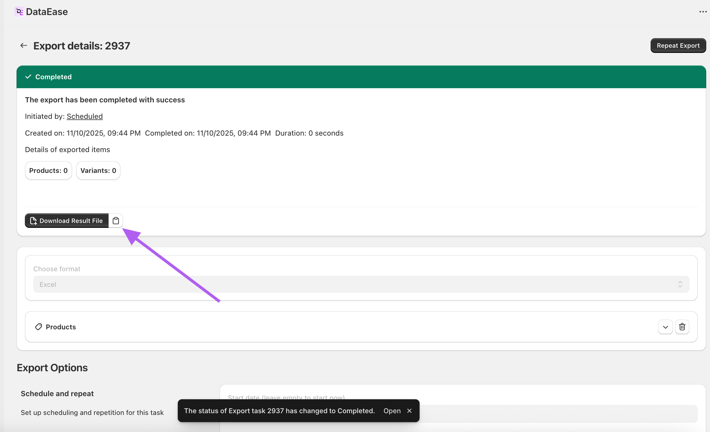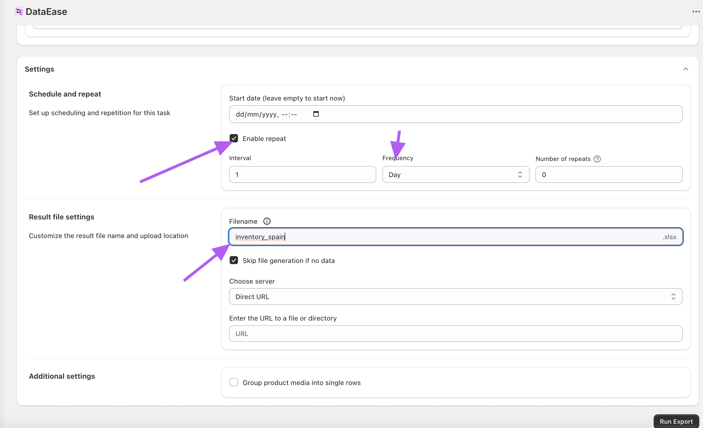 - In your export’s Schedule and repeat block, check Enable repeat and choose the desired frequency.